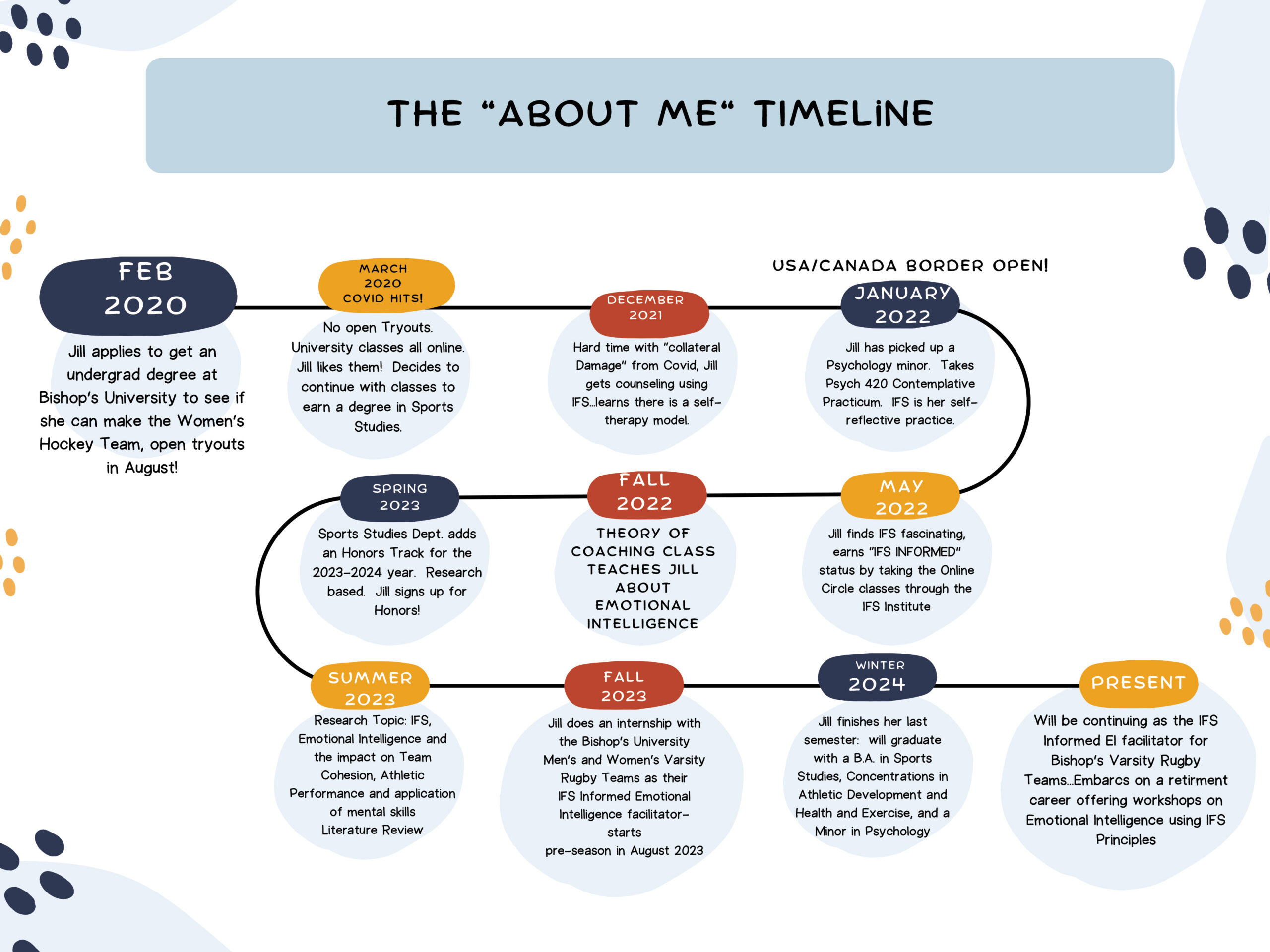 In my quest for a “retirement career” I completed my B.A. at Bishop’s University in Sports Studies, with concentrations in Athletic Development and Health and Exercise, and a minor in Psychology. Both my personal journey and my University studies have led to my immersion in Internal Family Systems, a self-therapeutic practice. I am currently “IFS Informed” through courses offered by the IFS Institute.